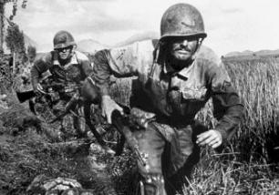 Not too fine a distinction was made between armed soldiers of the Viet Cong and peasants who might simply have been North Vietnamese sympathizers. Philip Jones Griffiths relates in his book how he went on one of the notorious 'search and destroy' raids with a detachment of inexperienced and rather nervous young soldiers. The moment then saw the figure of a Vietnamese farmer in the distance, they fired and missed. 'The next farmer was not so lucky. Soon he lay dying among the ripening rice in a corner of the paddy field, the back of his skull blown away. He was somewhat conscious, making a whimpering sound and trying to squeeze his eyes more tightly shut. He never spoke and died with the fingers of his left hand clutching his testicles so tightly they could not be undone. "Got him in the balls, knew I hit him," cried the boy from Kansas, until someone took him to one side and explained that they do that to relieve the pain from elsewhere.'